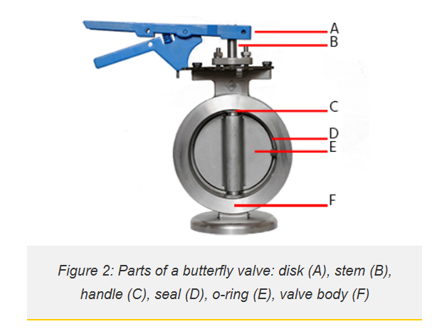 動作原理バタフライバルブは比較的単純な構造をしています。図 2 は、バタフライ バルブの主要コンポーネントである本体、シール、ディスク、ステムを示しています。バタフライ バルブのディスク (図 2 で E と表示) は接続された配管の中心に位置合わせされ、ステム (図 2 で B と表示) はバルブの外側のアクチュエーターまたはハンドルに接続されます。閉位置では、図 2 に示すように、ディスクは流れに対して垂直になり、弁座をシールします (図 2 の D)。ステムパッキン内の O リング (図 2 C とラベル付け) は、ステムに沿った漏れを防ぎます。アクチュエータまたはハンドルがバタフライ バルブ ステムを 90°回転させると、ディスクも 90°回転して流れと平行になります。部分的な回転により、流れを抑制したり比例させたりすることができます。